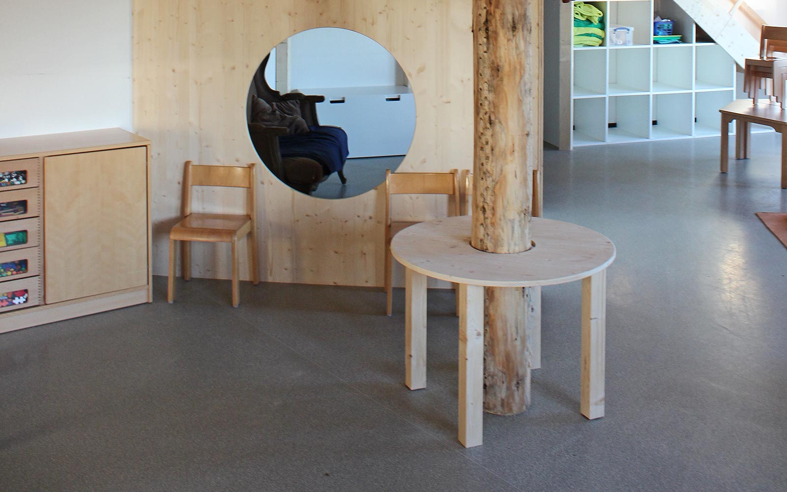 Bullaugen, wurde ein echter Baumstamm samt Tisch in die